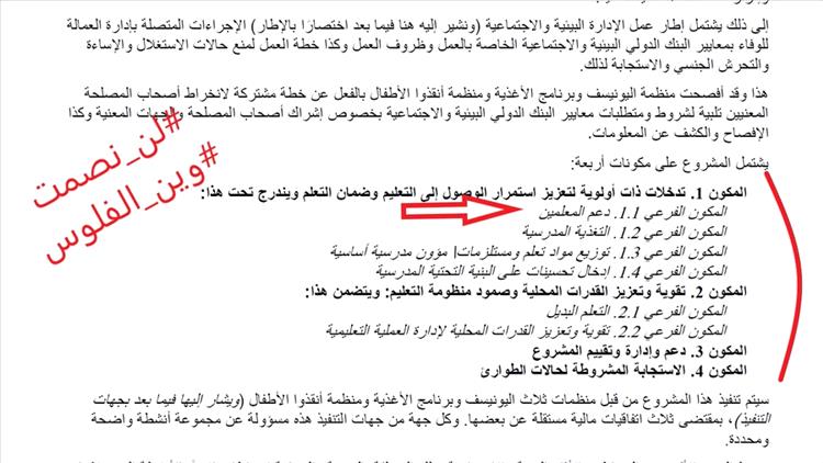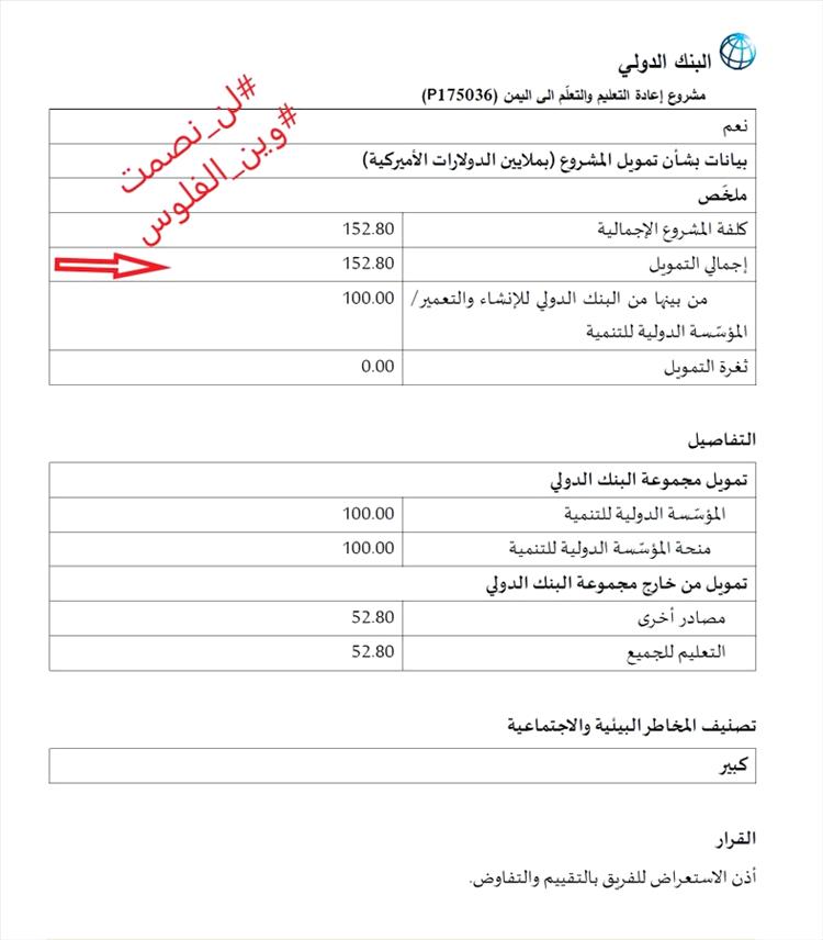 - مكونات المشروع أربع مكونات ومنها مكون لدعم المعلم بحوالات نقدية كحوافز ومخصص له 122 مليون دولار من المبلغ الاجمالي، وللأسف المعلمين بدون حتى مرتبات في مناطق سيطرة مليشيا الحوثي. ومعتمد من 2021