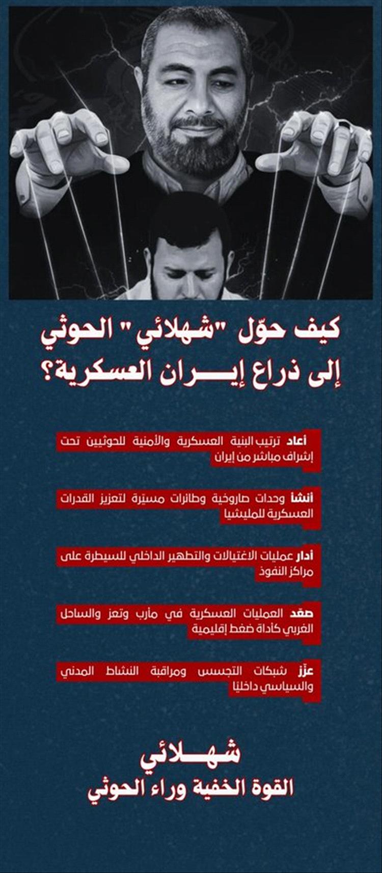 الصورة تعبّر بوضوح عن طبيعة العلاقة بين إيران والحوثيين: علاقة تحكم لا “دعم”، وإشراف لا “تنسيق”. الوجود البصري لشهلائي في الأعلى، ممسكاً بخيوط تحرّك شخصية حوثية بالأسفل، يجسد حقيقة معروفة لكنها كانت تُخفى تحت الضجيج الدعائي: