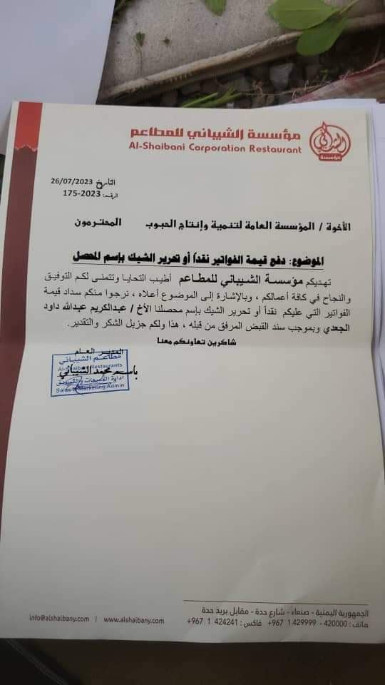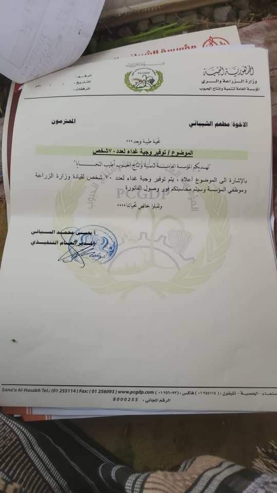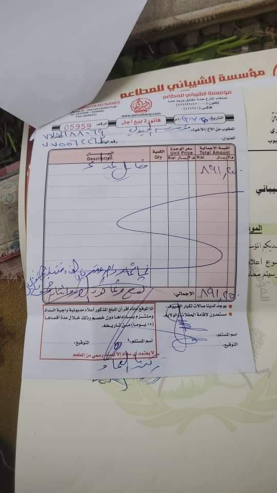 وقال النشطاء الغاضبون، أن فاتورة وجبة الغداء من مطاعم الشيباني، هي لوزير الزراعة ونائبه ومدير مؤسسة الحبوب ومرافقيهم بمبلغ يقارب المليون ريالا.