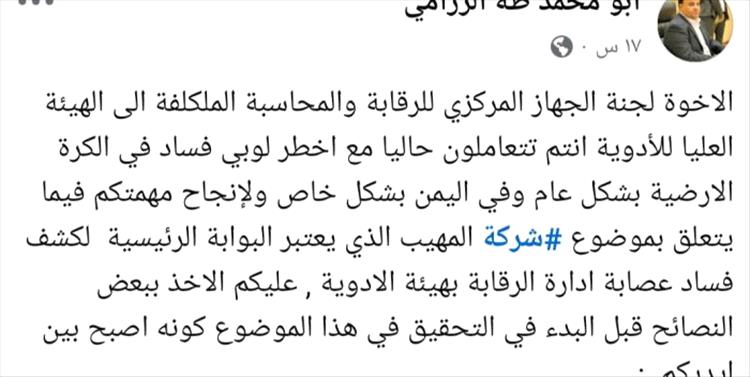 وقال الرزامي في منشور على فيسبوك: "أنتم تتعاملون حاليا مع أخطر لوبي فساد في الكرة الأرضية بشكل عام وفي اليمن بشكل خاص، ولإنجاح مهمتكم فيما يتعلق بموضوع شركة المهيب الذي يعتبر البوابة الرئيسية لكشف فساد عصابة إدارة الرقابة بهيئة الأدوية، عليكم الأخذ ببعض النصائح قبل البدء في التحقيق.