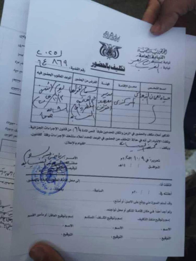 ونشر الناشط هاني الجنيد، مساء الاثنين، وثيقة تكليف رسمية صادرة عن النيابة العامة في تعز بتاريخ 9 أكتوبر، تقضي بحضور حياة الذبحاني يوم الاثنين 13 أكتوبر، دون توضيح الأسباب.
