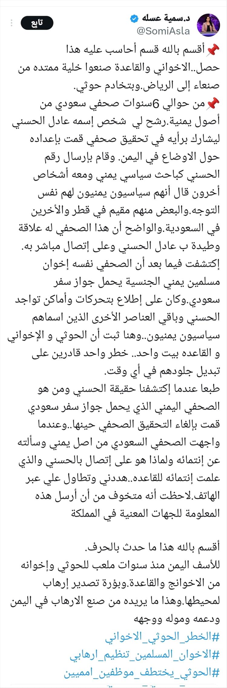 الدكتورة سمية عسله في تدوينة على منصة اكس، اقسمت بالله ان هذا الامر حصل، واوضحت "انه من حوالي 6 سنوات صحفي سعودي من أصول يمنية رشح لها شخص إسمه عادل الحسني ليشارك برأيه في تحقيق صحفي قمت بإعداده حول الاوضاع في اليمن".