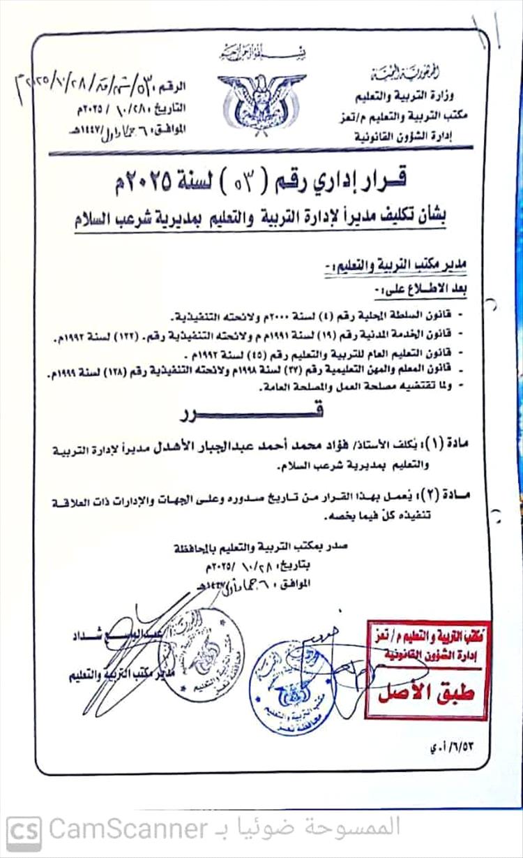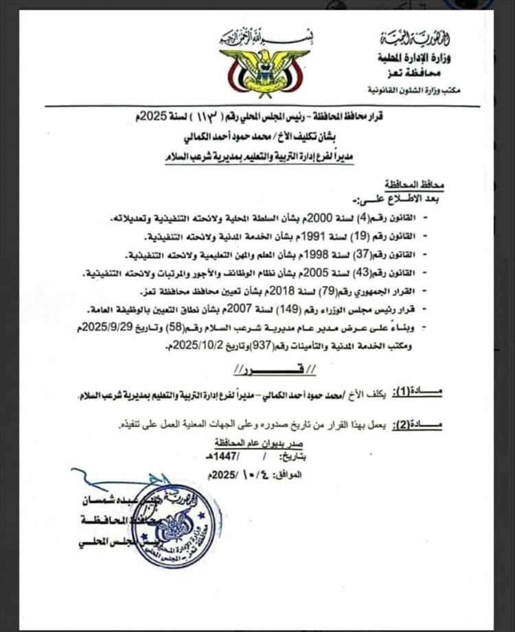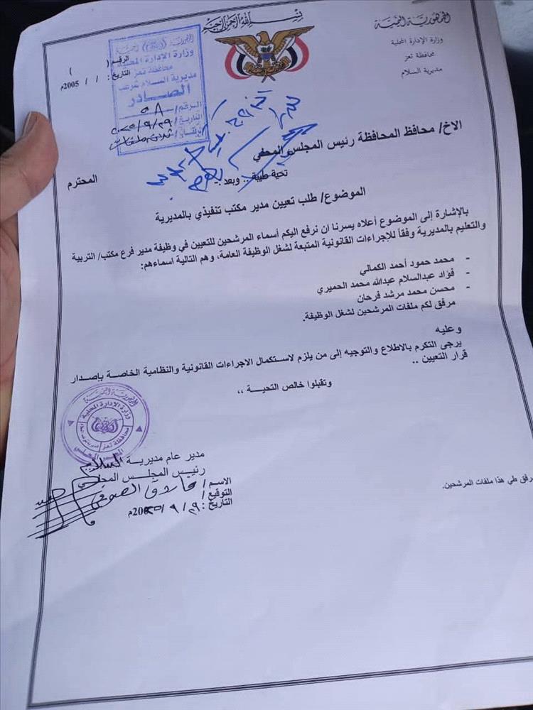 وكان المحافظ شمسان قد أصدر قبل أسبوعين فقط قرارًا بتكليف مدير لتربية مديرية شرعب السلام – الواقعة ضمن مديريات "شارع جمال" – بناءً على إجراء روتيني شكلي.
