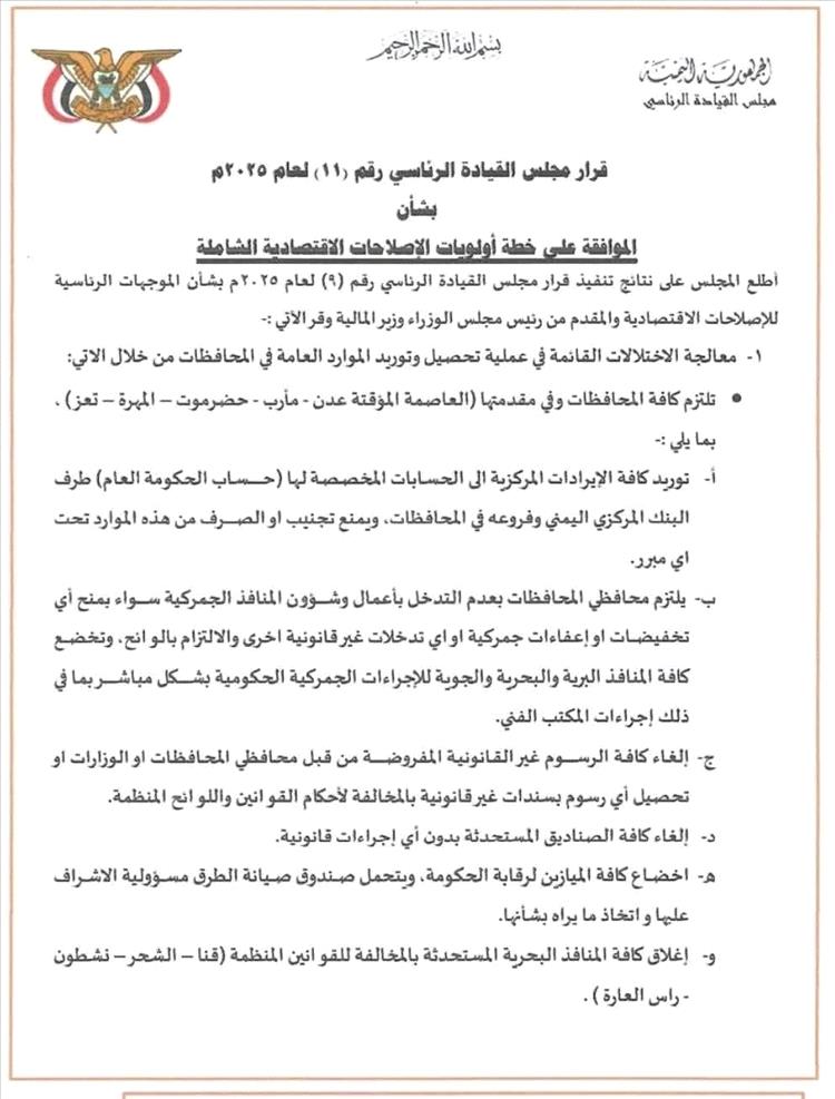 صدر قرار مجلس القيادة الرئاسي رقم (١١) لعام ٢٠٢٥م بشأن الموافقة على خطة أولويات الإصلاحات الاقتصادية الشاملة