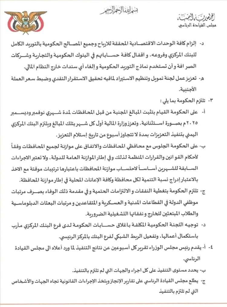 على الحكومة القيام بتثبيت المبالغ المجنبة من قبل المحافظات لمدة شهري نوفمبر وديسمبر ٢٠٢٥م بصورة استثنائية، وتعزز وزارة المالية أول كل شهر بتلك المبالغ، ويلتزم البنك المركزي اليمني بتنفيذ التعزيزات بمدة لا تتجاوز أسبوعًا من تاريخ استلام التعزيز.