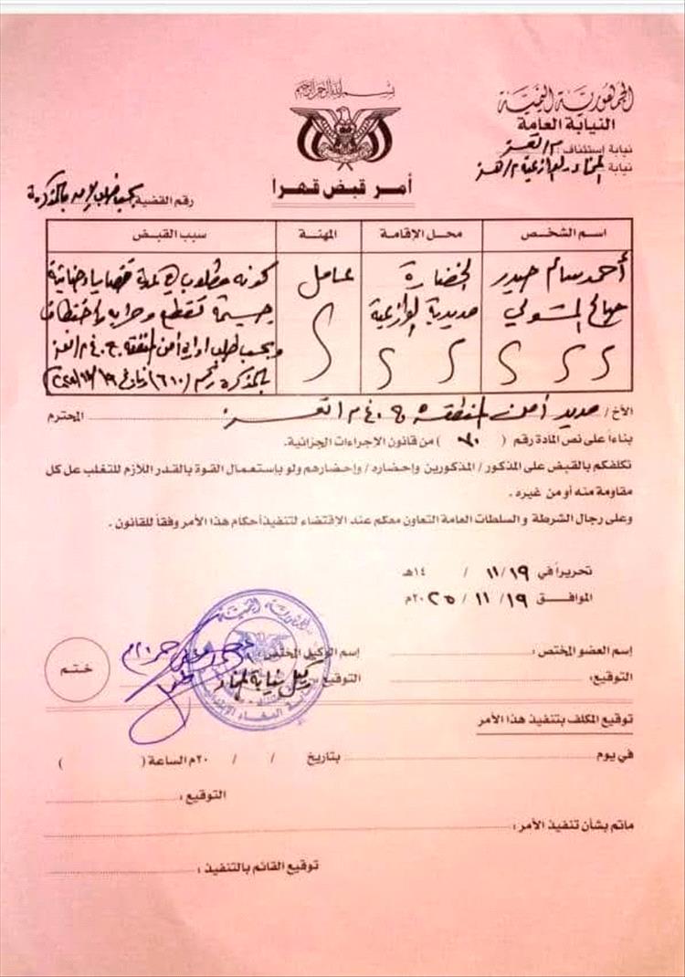 وتضمنت الوثيقة الصادرة عن النيابة العامة، أوامر بالقبض القهري على أحمد سالم حيدر صالح المشولي، في منطقة الخضارة بالوازعية كونه مطلوب في عدة قضايا جنائية جسيمة تشمل التقطع والحرابة والإختطاف.