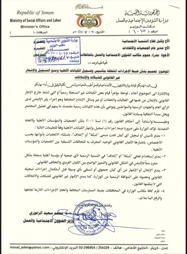 أصدرت وزارة الشؤون الاجتماعية والعمل تعميمًا رسميًا حذّرت فيه من استخدام مسميات مثل "شبكة" أو "ائتلاف" أو أي تسميات مشابهة دون تسجيل قانوني، مؤكدة منع ممارسة أو الإعلان عن أي نشاط أهلي قبل استكمال إجراءات الإشهار الرسمية.