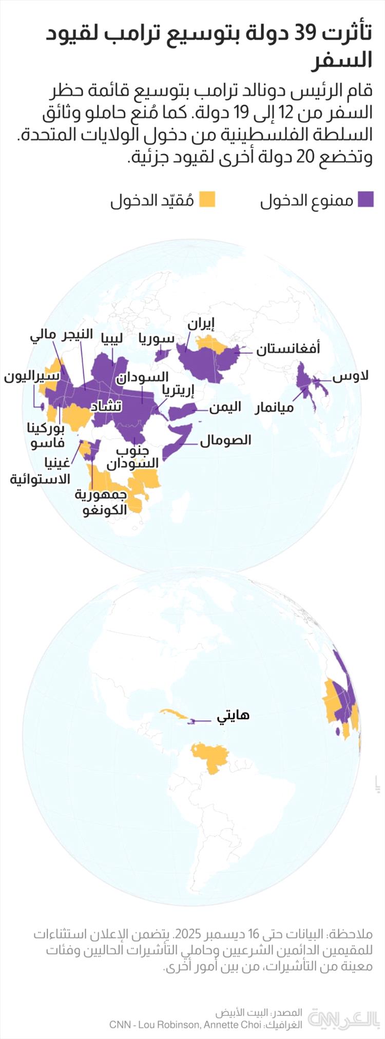 أعلنت إدارة ترامب اليوم عن توسيع قائمة الدول التي تفرض قيودًا كاملة أو جزئية على السفر إلى الولايات المتحدة، لتشمل 39 دولة بينها اليمن، بعد أن كانت تضم 19 دولة فقط، وذلك وفقًا لبيان جديد صادر عن البيت الأبيض.