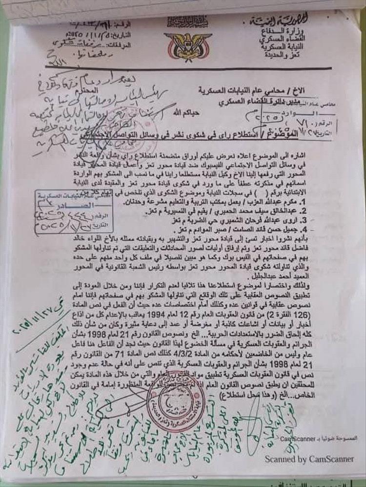 وتضمنت الدعوى مطالبات بإنزال عقوبة الإعدام بحقهم، بدعوى قيامهم بإعاقة محور تعز عن تحرير الأجزاء المتبقية من المحافظة، والتأثير على معنويات قوات المحور من خلال ما ينشرونه في صفحاتهم الشخصية، وما تتداوله المواقع الإخبارية وتنقله صفحات أخرى عنهم، أو عبر تصريحاتهم.