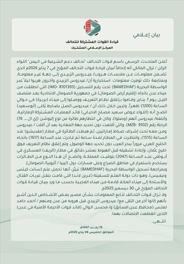 وذكر البيان ان معلومات استخباراتية اظهرت ان الزُبيدي وآخرون غادروا بحرا من ميناء عدن باتجاه ميناء بربرة بأرض الصومال في جمهورية الصومال الاتحادية ومنها جوا إلى العاصمة مقديشو التي ظل فيها لمدة ساعة قبل أن تنطلق الطائرة التي تقله باتجاه الخليج العربي مرورا ببحر العرب دون تحديد وجهتها بعد إغلاق نظام التعريف فوق خليج عمان.