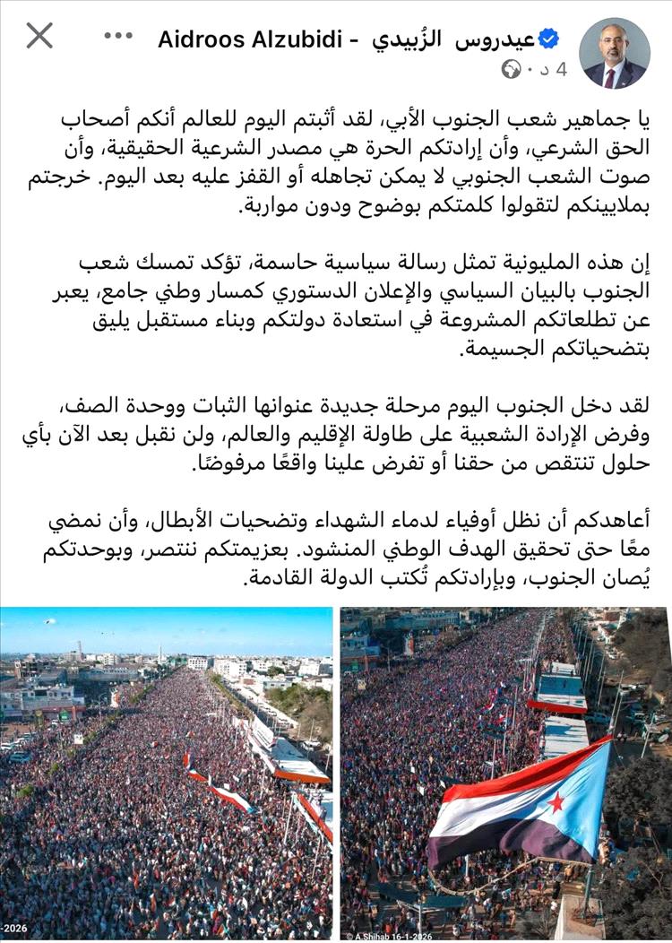 وقال الزبيدي في منشور رصده نافذة اليمن على حسابه الرسمي بموقع فيس بوك مساء اليوم الجمعة، :"يا جماهير شعب الجنوب الأبي، لقد أثبتم اليوم للعالم أنكم أصحاب الحق الشرعي، وأن إرادتكم الحرة هي مصدر الشرعية الحقيقية، وأن صوت الشعب الجنوبي لا يمكن تجاهله أو القفز عليه بعد اليوم. خرجتم بملايينكم لتقولوا كلمتكم بوضوح ودون مواربة".