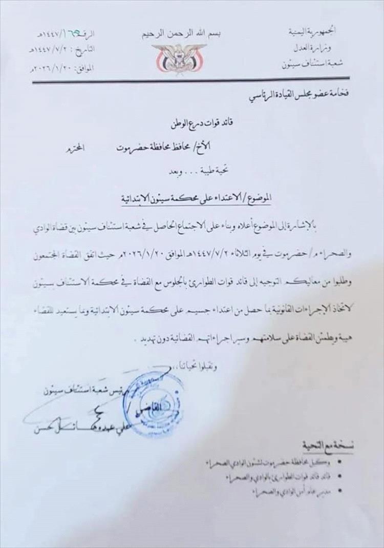 وبحسب مصادر قضائية، فقد قرر القضاة توجيه خطاب رسمي إلى عضو مجلس القيادة الرئاسي وقائد قوات درع الوطن، محافظ حضرموت سالم الخنبشي، للمطالبة بالتدخل وتوجيه قائد قوات الطوارئ بالجلوس معهم في محكمة الاستئناف واتخاذ الإجراءات القانونية اللازمة تجاه المعتدي.