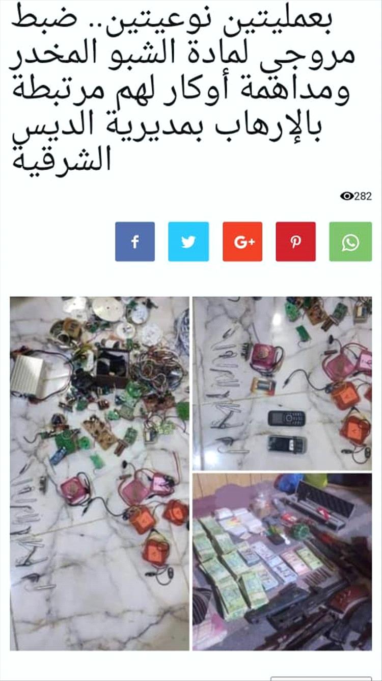 واعلنت ادارة مكافحة المخدرات بساحل حضرموت في ذاك التاريخ انها نفذت عمليتين نوعيتين أسفرت الأولى عن القبض على مروجين لمادة الشبو المخدر بالشارع تقوم بترويج مادة الشبو، والعملية الثانية داهمت أوكار مروجي لمادة الشبو وتبين ارتباطهم بعناصر إرهابية حيث عثر على مواد ومعدات لتصنيع عبوات ناسفة.