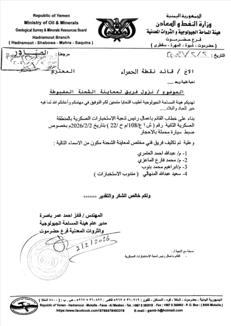 وبناءً على توجيهات القائم بأعمال رئيس شعبة الاستخبارات العسكرية، تم توقيف سائق الشاحنة والتحفّظ على الحمولة، وإبلاغ فرع هيئة المساحة الجيولوجية والثروات المعدنية بحضرموت لتقييم الشحنة واتخاذ الإجراءات القانونية اللازمة.