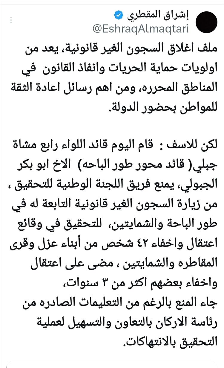 كشف وزير الشؤون القانونية المعينة حديثًا في الحكومة اليمنية، إشراق المقطري، في تغريدة على حسابها الرسمي، عن منع فريق اللجنة الوطنية للتحقيق من زيارة سجون غير قانونية تديرها قيادات عسكرية موالية لحزب الإصلاح الإخواني في مناطق جنوبية محررة، في تصعيد جديد يثير القلق حول وضع الحريات وحقوق المواطنين في تلك المناطق.