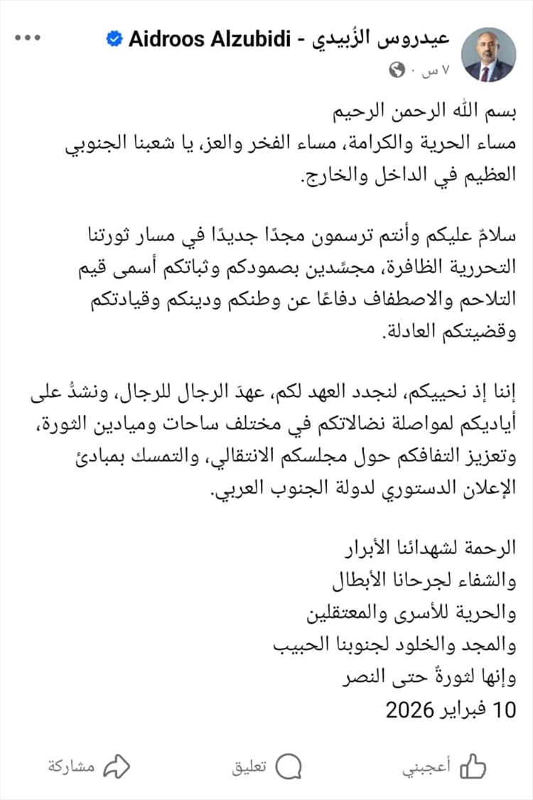 وجاء ظهور الزُبيدي عبر منشور في صفحته الرسمية على فيسبوك وجه فيها رسالة إلى انصاره ودعاهم إلى الصمود والثبات، مجددا عهد الرجال للرجال.