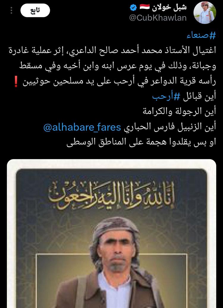 وأكد ناشط محلي بارز على موقع إكس تحت حساب مستعار باسم "شبل خولان" ، أن الضحية محمد أحمد صالح الداعري سقط قتيلاً على الفور إثر إطلاق نار مباشر من قبل مسلحين ينتمون إلى مليشيا الحوثي.