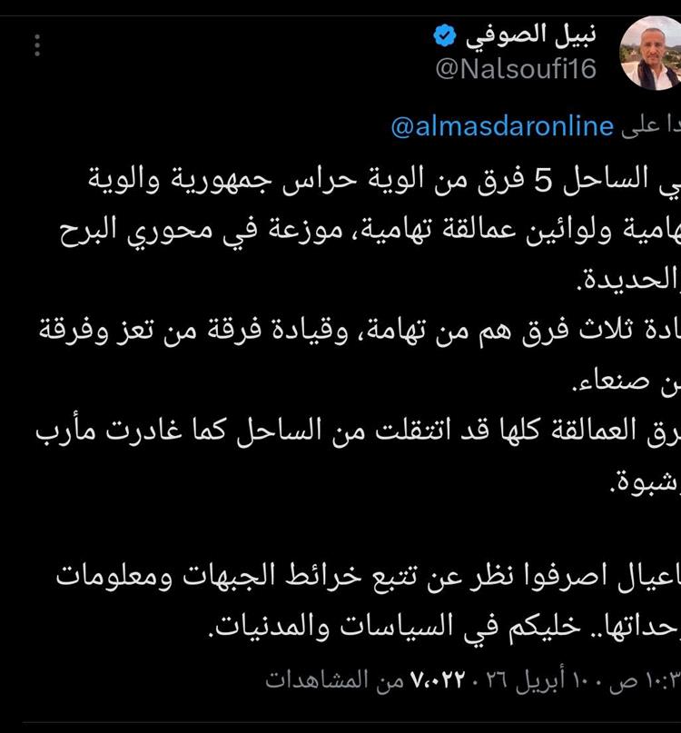 وفي رده على هذه المزاعم، على منصة إكس وفق ما رصده محرر (نافذة اليمن)، أوضح الصحافي السياسي نبيل الصوفي انه يوجد في الساحل 5 فرق من الوية حراس جمهورية والوية تهامية ولوائين عمالقة تهامية، موزعة في محوري البرح والحديدة.