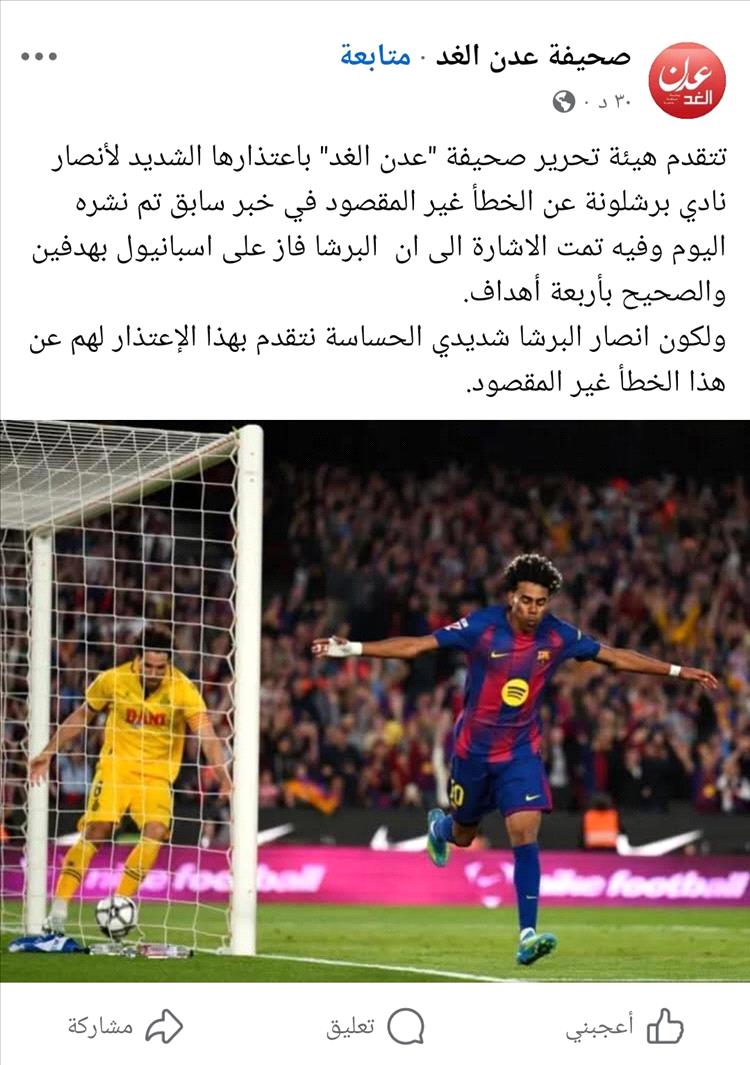 وقالت صحيفة عدن الغد في حسابها على فيسبوك، "تتقدم هيئة تحرير صحيفة "عدن الغد" باعتذارها الشديد لأنصار نادي برشلونة عن الخطأ غير المقصود في خبر سابق تم نشره اليوم وفيه تمت الاشارة الى ان البرشا فاز على اسبانيول بهدفين والصحيح بأربعة أهداف".