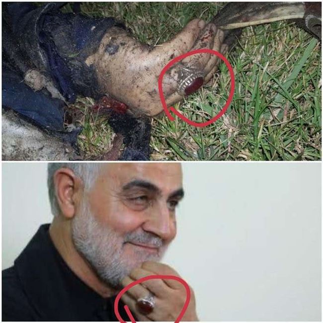 وظهر في الصورة وجود خاتم في أحد الأصابع اليد، وهو خاتم عادة ما كان يظهر به سليماني، واعتبر الناشطون أن وجود هذا الخاتم دليل على أن هذه الجثة تعود لسليماني بالفعل.