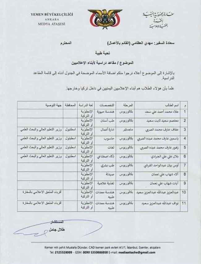 بحسب الوثيقة التي قالت عنها المصادر الدبلوماسية في سفارة اليمن بتركيا أنه تم الموافقه عليها واعتمادها من قبل السفارة ضمن المقاعد الدراسية القادمة.